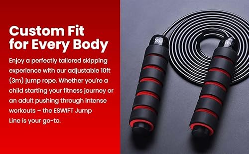 Produktbeschreibung: ESWIFT Jumping Premium-Sprungschnur – verstellbare Länge, rutschfeste Griffe, Hochgeschwindigkeits-Springseil für Fitness, Cardio und Training – 2.8 m lang für Kinder und Erwachsene (Rot)